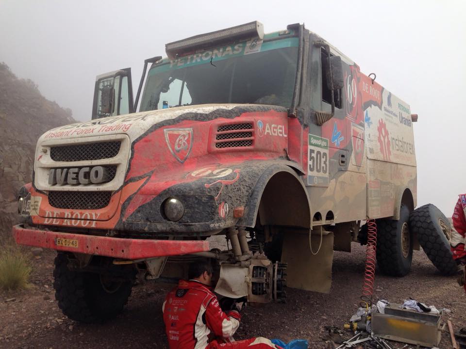 „Omlouvám se všem za komunikační výluku způsobenou nocováním ve spojovací etapě ve výšce 4000 metrů nad mořem bez možnosti běžné komunikace. Včerejší etapa byla poněkud zvláštní. Pravděpodobně předešlé vydatné deště a všudy přítomné bláto se podepsaly na elektronice našeho vozidla. Těsně před startem nám odešel systém dohušťování pneumatik, následně ihned po startu spodní řada rychlostních stupňů a kousek za polovinou erzety pohon 4x4. Nicméně do cíle jsme dodriftovali jen se zádním náhonem ve velmi slušném čase, a já byl šťastný, že jsme to s autem, které nebylo ve 100% kondici dotáhli do cíle. Následně jsme pokračovali spojovací etapou do maratonského bivaku.