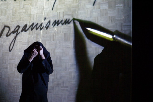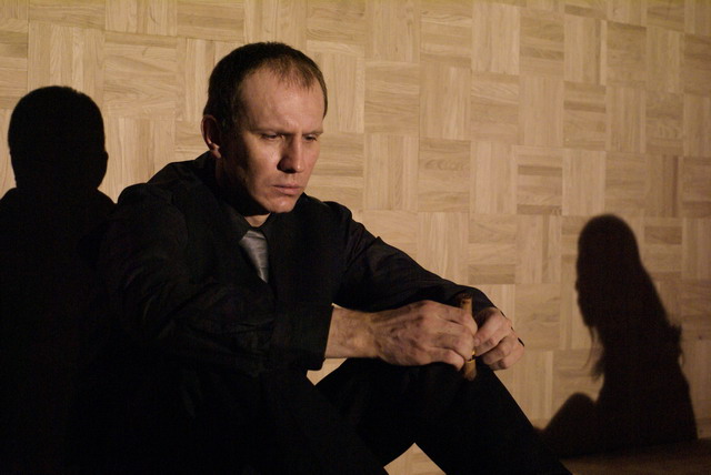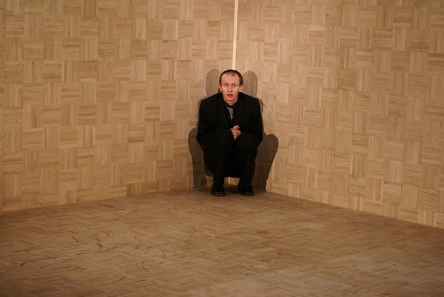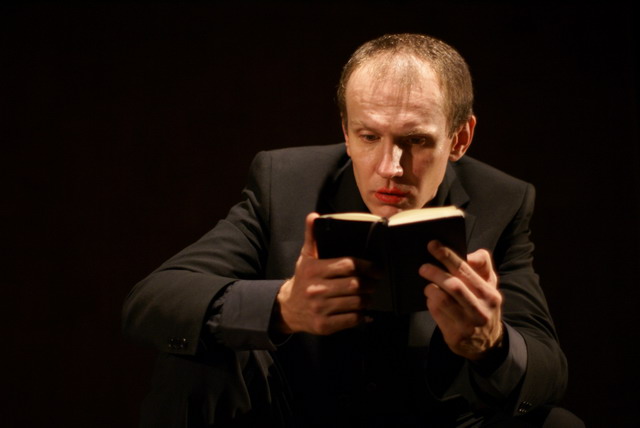 Díky tomuto scénografickému řešení je hrdina vržen těsně před diváky, kteří mohou zblízka sledovat každičkou jeho grimasu i sebemenší pohyb. Finger hraje velmi úsporně a civilně; místo pohybu či velkých gest setrvává převážně v seškrobeném, křečovitém postoji. Jeho řeč prozrazuje zpočátku povýšenost. Nechce věnovat více energie takovým obejdům, jakými jsou oba hlídači, kteří naruší železně pravidelný chod jeho domácnosti. S překvapivě minimalistickými prostředky dokáže Finger uhrát první, vyprávěnou část, zahrnující dialogy různých postav, do nichž vkládá velmi jemně i prvky humoru.