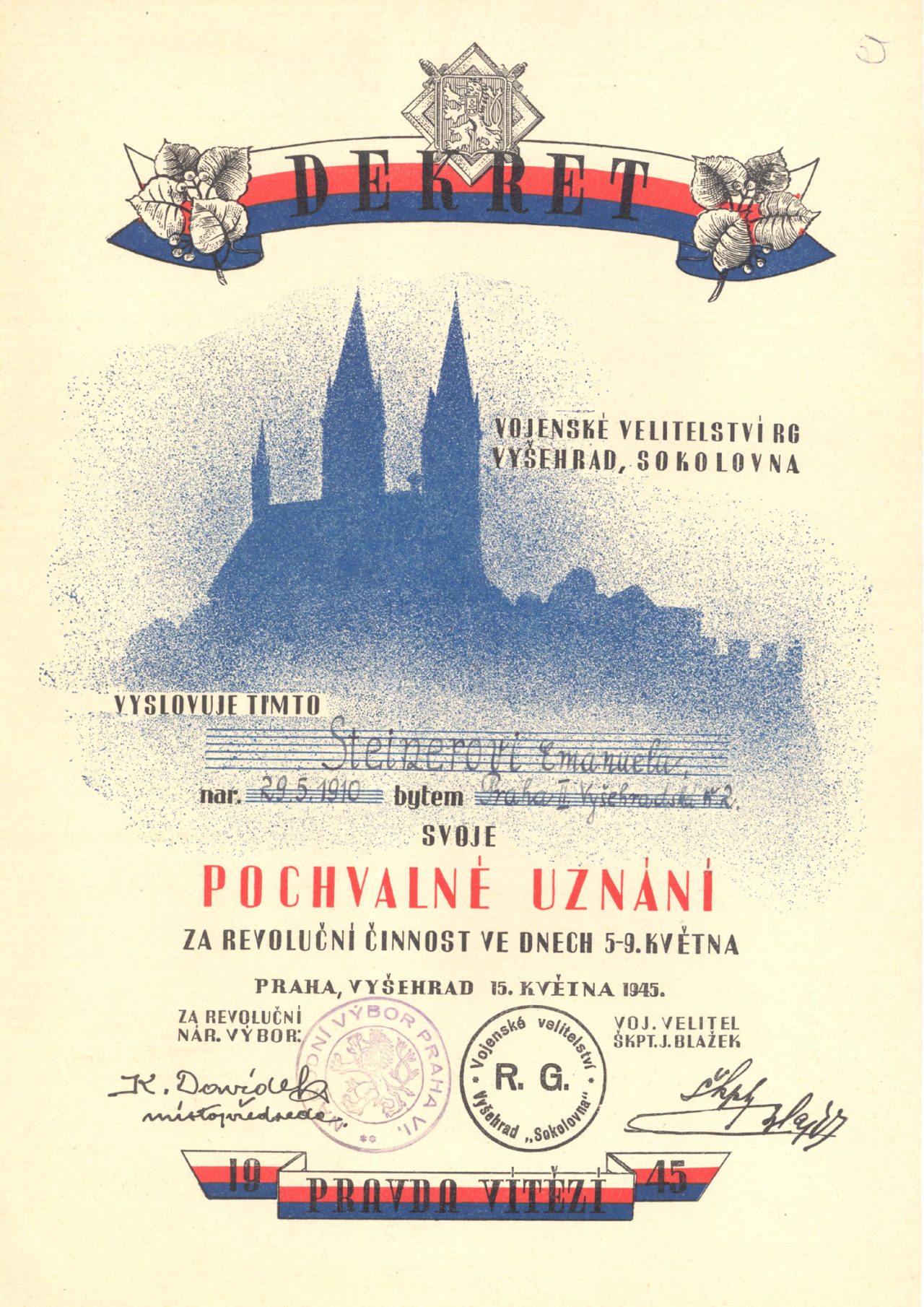Antonie Steinerová, provdaná Štrejlová, dnes s láskou schraňuje všechny dokumenty o Emanuelovi Steinerovi a vyznamenání, která dostal in memoriam. Celou dobu touží po tom, aby si mohla poslechnout i záznam hlasu svého statečného táty. V Archivu Českého rozhlasu se ale do dnešní doby nedochoval.