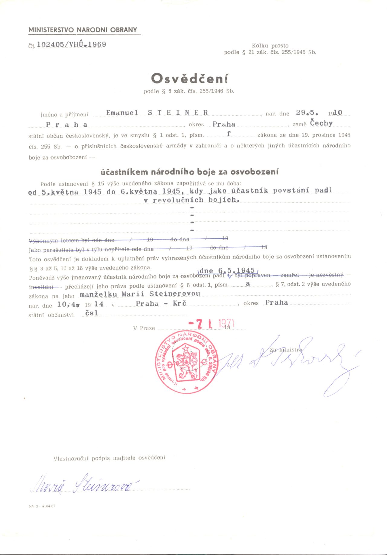 V roce 1946 vysílal Československý rozhlas pořad s nahrávkami účastníků Pražského povstání a vyzýval, aby se přihlásili ti, kteří některý hlas poznají. Emanuelův otec mezi nimi poznal hlas svého syna. S bratrem, manželkou a dcerami Emanuela se tehdy do rozhlasu vypravili. Josef Steiner pak pátral po osudu svého syna Emanuela celý život.