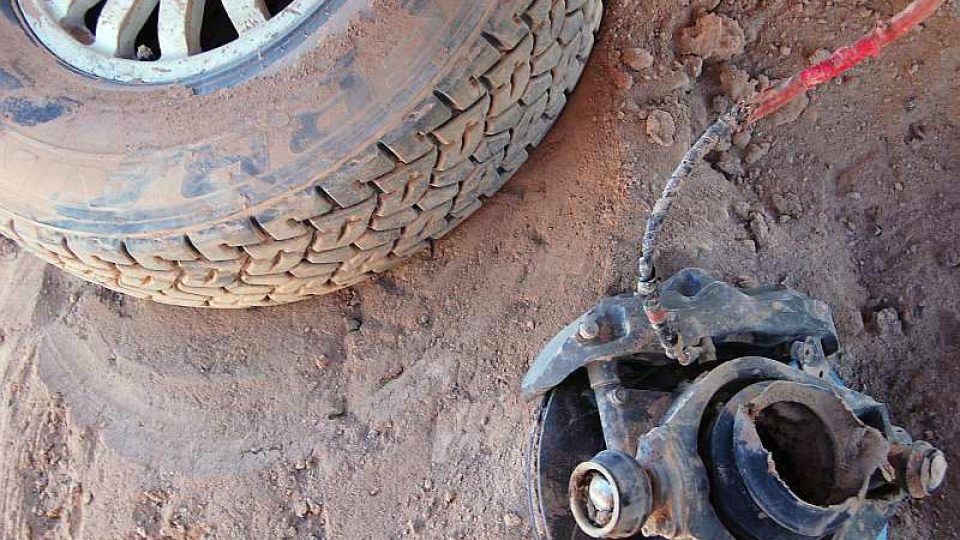 "Jeli jsme poměrně rychle. Byla to pouštní planina s mnoha nerovnostmi, ale i přesto se dalo jet rychle. Za přejezdem jednoho horizontu byla schována díra o průměru zhruba tři metry, do které auto spadlo. Ve vysoké rychlosti narazilo do protější stěny díry a naštěstí se od přední nápravy, která se na straně spolujezdce zcela utrhla, odrazilo a skočilo asi 15 metrů. Po dopadu se ihned zastavilo. Náraz byl však tak obrovský, že Mirkovi praskla páteř. Já mám jen naražená záda."