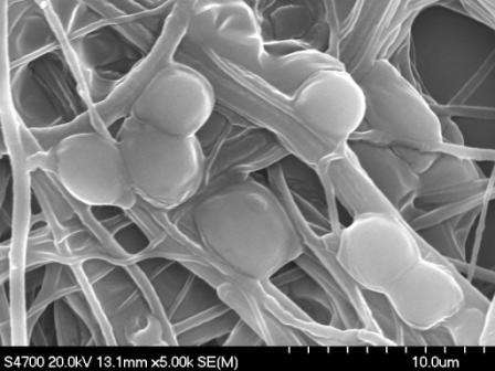 Miroslav Černík: Univerzita má na to celosvětový patent - známý český vědec profesor Oldřich Jirsák. Využití těch nanovláken je široké. Například jedna z možností je automobilový průmysl, kde lze využít jejich vlastnosti pohlcování hluku. Otázkou je cena takového materiálu. Jsou drahé. Další oblast, kde my ta nanovlákna se snažíme použít, je čištění odpadních vod. Máme určitý projekt a snažíme se na těchto nanovláknech pěstovat bakterie, které jsou pak schopny čistit odpadní vody. A ty bakterie, protože nanovlákno má zase obrovský měrný povrch, daleko lépe ulpívají na těch nanovláknech, než na jiných nosičích. Jsou tam pevnější, méně náchylné vůči změnám prostředí a podobně. Další možnost je využití nanovláken jako filtračního materiálu pro filtrování vod a vzdušnin, kde jsou nanovlákna schopna zachytávat samozřejmě zase velice malé částice, ať už to jsou částice prachové nebo třeba i viry.