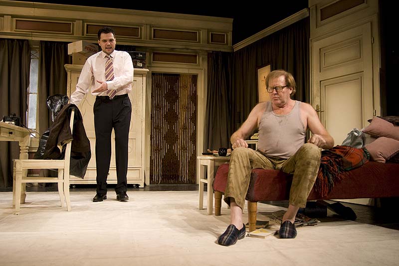 K uvedení autorovy prvotiny, která překvapí živoucími lidskými typy a vtipně vypointovanými, nepodbízivými dialogy, se sešel excelentní inscenační tým - zkušená dramaturgyně Johana Kudláčková a režisérka Lída Engelová, která precizním propracováním celku i detailů inscenace vytvořila prostor pro pozoruhodné výkony herců. A právě ty dělají z představení skutečný zážitek: Jan Vlasák obdařil nesnesitelně popudlivého nepořádníka Freda Kowinského gejzírem nepotlačitelné energie, takže není divu, že s takovým neurvalcem nemůže vydržet žádná z hospodyní, jež mu shání jeho syn. Fredova jediného kamaráda Walta, který k němu každé úterý chodívá na partii šachů, vykreslil Petr Štěpánek jako pomalejšího, poněkud umanutého sklerotika, s nímž také nelze snadno vyjít, natož dohrát alespoň jednu šachovu hru. Oba bručouni jsou vlastně velmi opuštění, takže šachové sedánky tvoří základní jistotu a smysl jejich jinak prázdného bytí. Hospodyni Rosalindu, vnímavou chytrou ženu, která se jen tak něčeho nelekne, hraje Jitka Smutná s přesnou mírou nadhledu, vtipu i sebejistoty.