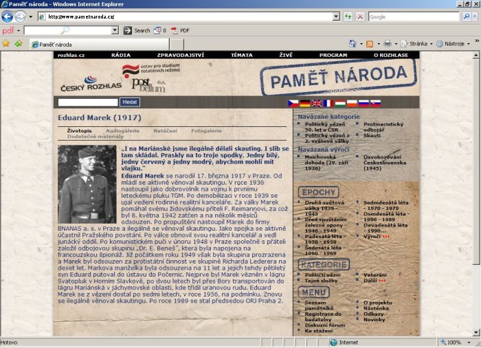 Naše republika dostává ke svým devadesátým narozeninám unikátní dárek. V den 90. výročí vzniku ČSR byl oficiálně spuštěn největší evropský pamětnický portál Paměť národa a s tím spojená elektronická badatelna. Portál nejen odborníkům, ale i široké veřejnosti zpřístupní audiovizuální vzpomínky stovek přímých aktérů těch nejvýznamnějších událostí z naší pohnuté moderní historie. Portál je budován dva roky sdružením Post Bellum, Českým rozhlasem a poslední rok také Ústavem pro studium totalitních režimů.