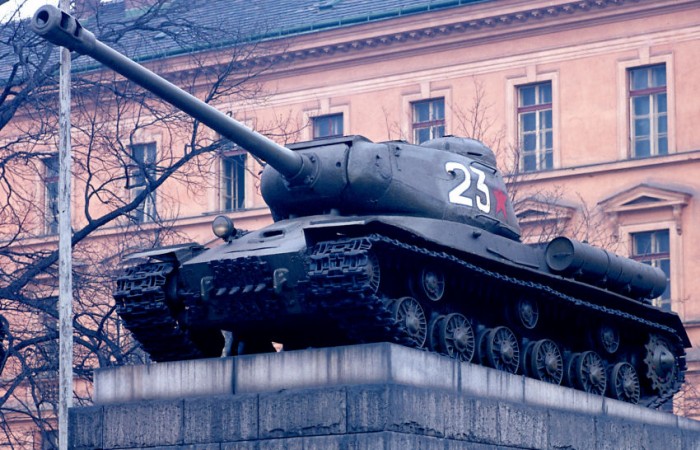 Ohořelý tank byl jako symbol osvobození nepoužitelný a tak Sověti dovezli jiný typ, podstatně větší tank, který těsně předtím sjel z výrobního pásu a byl válkou naprosto netknutý. „Sověti chtěli ukázat, že mají na víc, takové velikášství. A tak z Drážďan převezli do Prahy těžký tank, Josef Stalin verze dva (Tank IS-2).“
