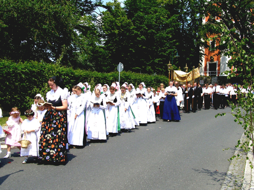 "Ve všech našich katolických farnostech se při svátku Božího těla pořádají velká procesí, věřící kráčejí po vesnici, zastaví se a pomodlí u malých oltáříků. Těchto průvodů se zúčastňují také dívky v krojích katolických družiček a rovněž mnoho žen oblékne při takové slávě lidový kroj. Je to velmi slavnostní... Neděláme to kvůli turistům, pro nás je to církevní svátek."